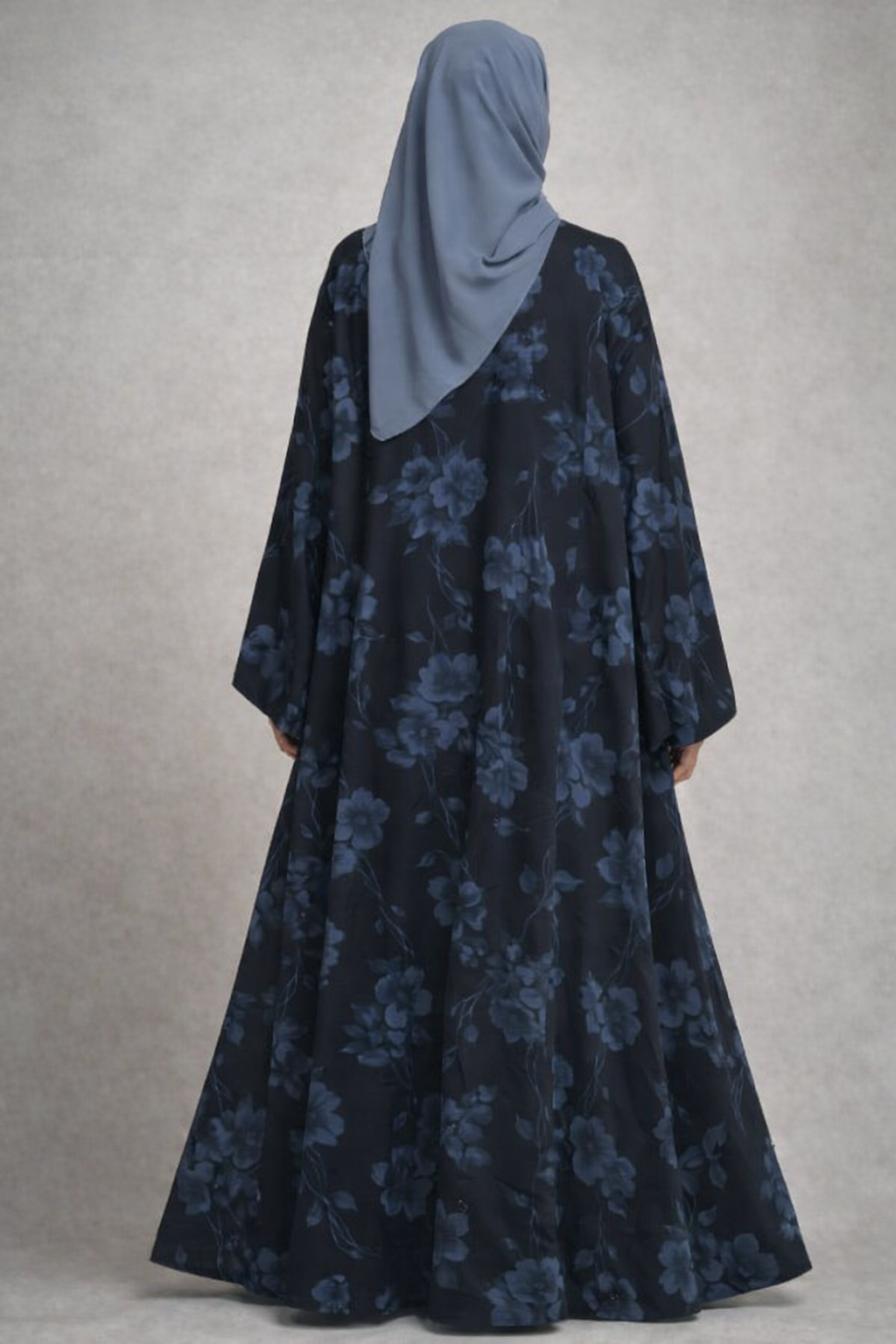 An elegant black abaya enriched with dusky blue floral patterns, creating a serene and sophisticated look. Its fluid drape and subtle detailing make it a refined choice for graceful, modern modest wear.
