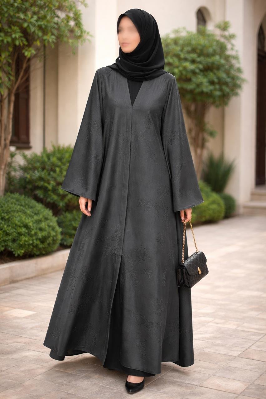 A classic black abaya with a flowing silhouette and understated texture, designed to exude timeless elegance and effortless modesty.