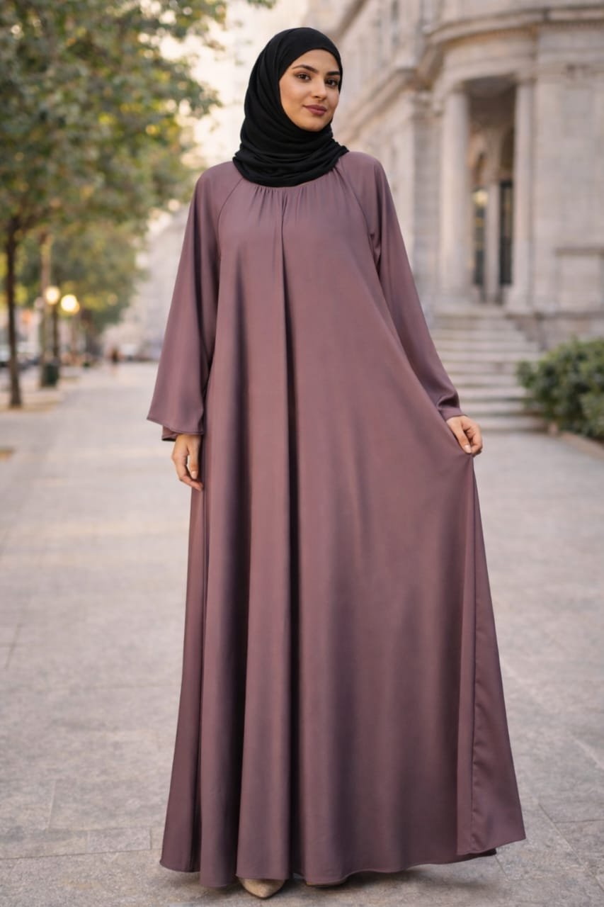 The  Mauve Grace Abaya embodies effortless modesty with a soft, flowing charm. Crafted in a soothing mauve tone, this abaya features a relaxed, gathered neckline that falls into a beautifully draped silhouette, creating natural movement with every step.