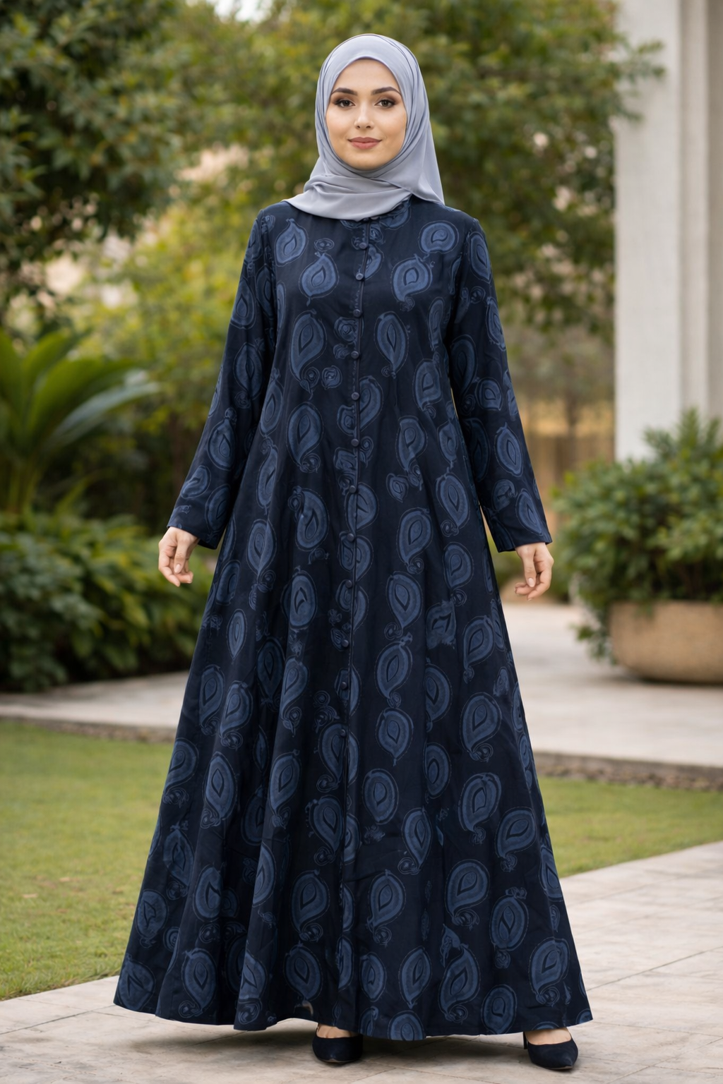A flowing navy abaya adorned with subtle paisley motifs, designed in a relaxed silhouette for effortless elegance. Soft, discreet front buttons and a modest, loose fit make it perfect for refined everyday wear while maintaining timeless grace.