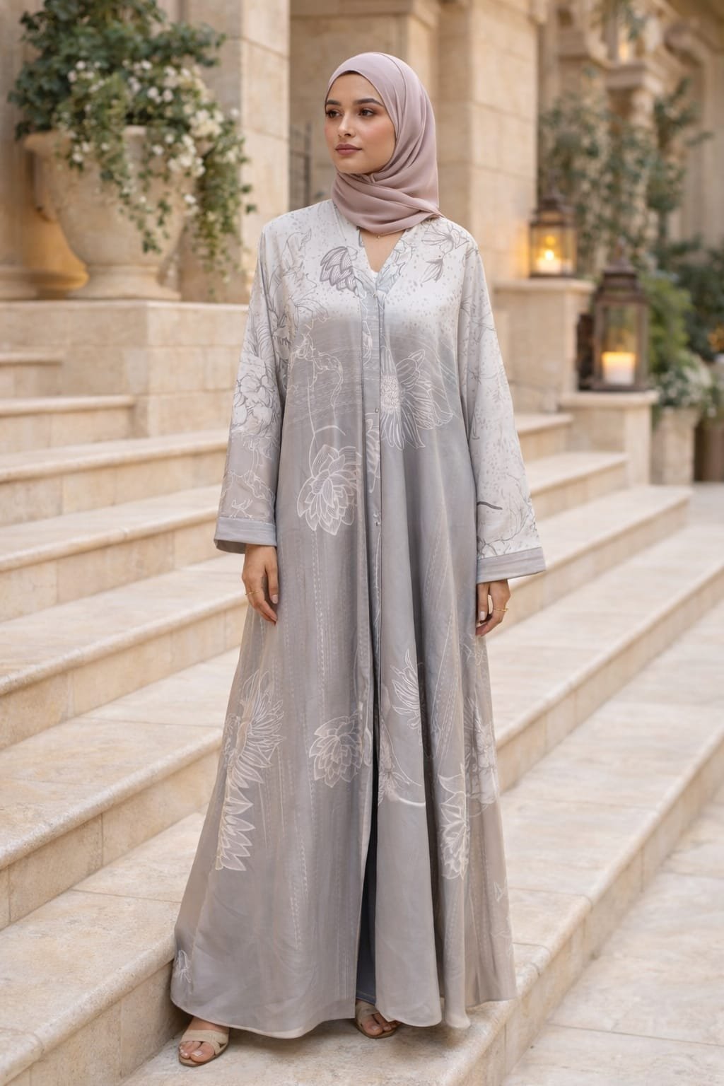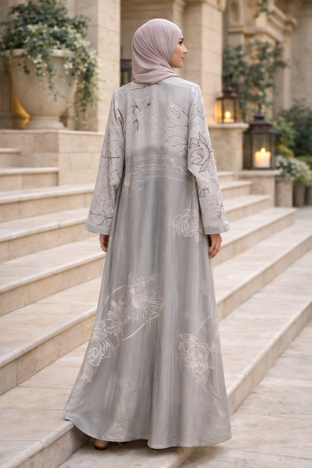 Serene Bloom Abaya features a soft dove-grey base adorned with delicate white floral motifs that flow gracefully from front to back. Its airy silhouette and subtle detailing create a calm, refined look—perfect for women who love timeless elegance with a gentle, feminine touch.