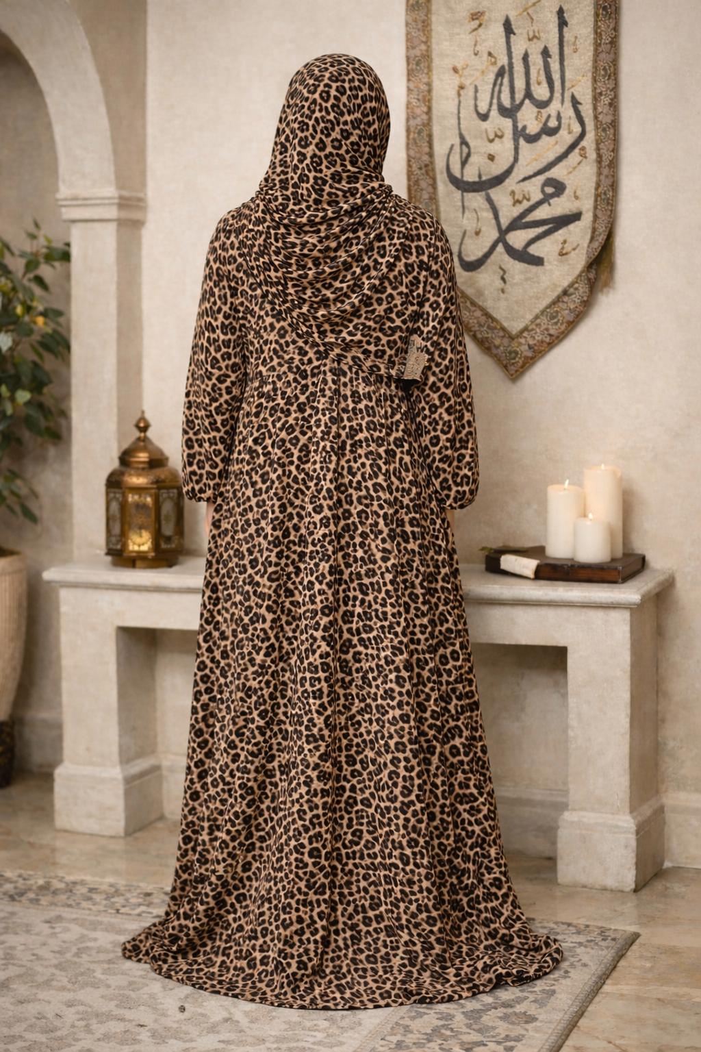 A bold yet elegant leopard-print prayer gown paired with a neatly wrapped matching scarf. Designed with a flowing silhouette and soft fabric, this set combines confident style with full modest coverage—perfect for making a graceful statement during moments of devotion. Providing full body coverage. Available in soft summer chiffon fabric.